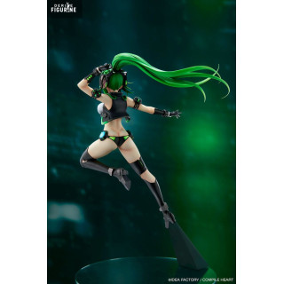 Her design is striking: vivid green hair flowing dramatically, matte black mechanical armor with metallic accents, and bright translucent green blades attached to articulated arms. Her minimalist outfit keeps the Neptunia aesthetic intact while merging seamlessly with the complex mechanical design. The clear base adds a weightless, mid-air illusion.