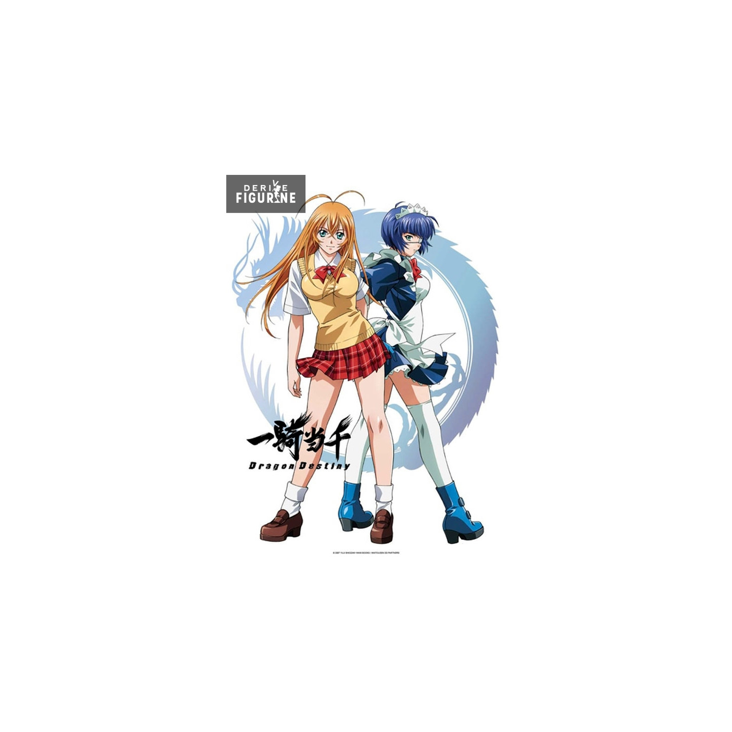 Here is a poster with the main characters of Ikky Tousen : Dragon Destiny. Hakufu Sonsaku faces us while Shimei Ryomou presents us his best profile. The two women lay their hair and skirts in the wind. A beautiful dragon appears in the background.
