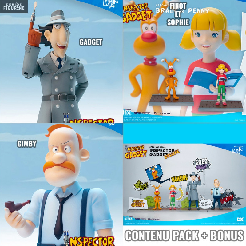 Inspector Gadget is one of the cartoons that rocked the childhood of many children and he made us all dream with his many accessories that he uses to solve mysteries. In order to immerse yourself in childhood, you can therefore offer yourself a figurine of chef Gimby (~ 13 cm) and his trash can as well as his mission paper, Brain (~ 11 cm) and Penny (~ 13 cm) with their Mexican camouflage, Gadget (~ 17 cm) and its many accessories, or finally the Pack where they are all, with more comic bubbles.