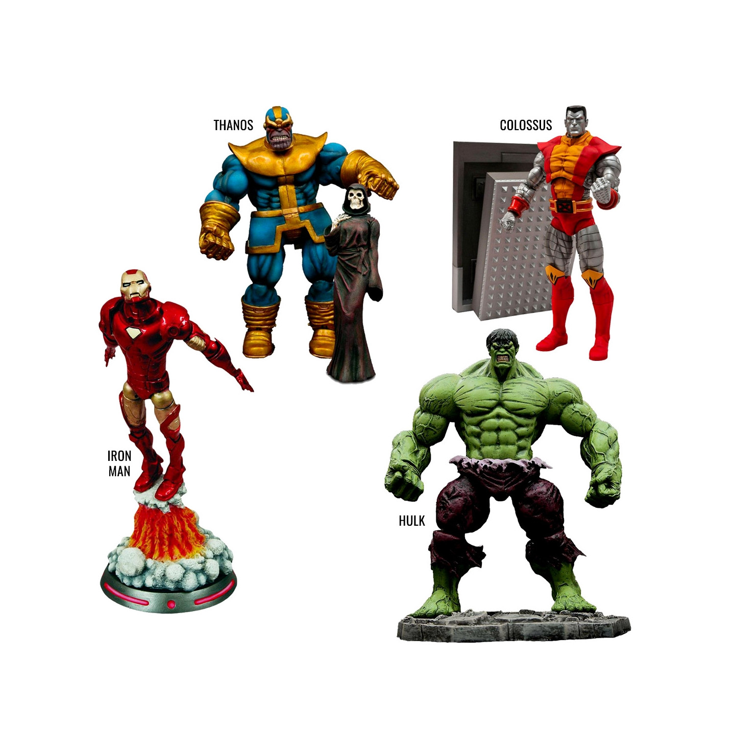 Official figure of your choice between Iron Man (~18 cm), Hulk (~25 cm), Colossus (~20 cm) or Thanos (~20 cm). It is from the Marvel Select collection. The manufacturer is Diamond Select Toys.