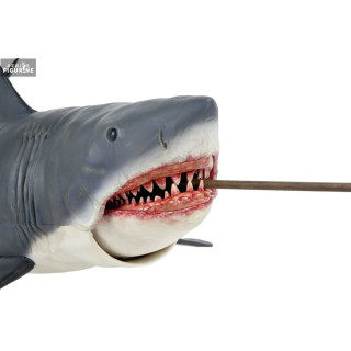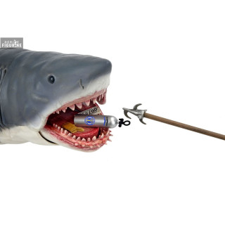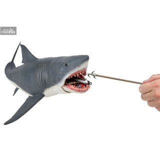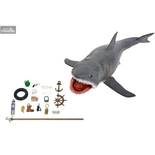 This The Game of Jaws - 50th Anniversary figure measures 38 cm in length and features an impressively detailed sculpt, capturing the razor-sharp teeth and rough skin texture of Bruce. What truly makes this piece special is the vast array of accessories included, inspired by memorable moments from the film: a rusty anchor, a barrel, a boat license, beer cans, a radio, a human skull, fish remains, and more.