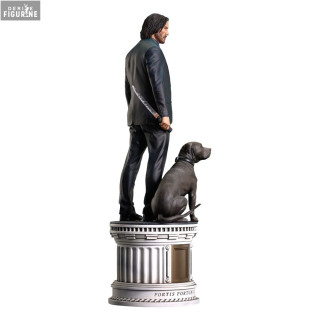 This figure depicts John Wick in a calm yet ready-for-action pose, holding a katana in one hand and a handgun in the other, prepared to face anyone who stands in his way. At his feet, his dog, a symbol of his quest for vengeance and loyalty, remains vigilant, perfectly capturing the spirit of the film where action never ceases. The base of the figure, designed to resemble a classical pedestal with the Latin inscription "Fortis Fortuna Adiuvat" (Fortune Favors the Bold), adds a touch of sophistication and history to this collectible piece.