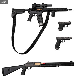 Here is a figurine representing our dear John Wick, the hitman. It is articulated, sold with weapons as an accessory, but also a black dog. It also has interchangeable faces, one classic and the other injured.