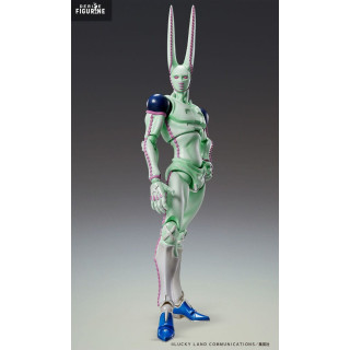 Sporting a pale green body with metallic navy highlights and mechanical detail, D4C is highly poseable and packed with accessories. From its intense stare to its towering ear-like blades, every element of this figure captures the surreal aesthetic of Hirohiko Araki’s world. The sculpting on the joints and armor-like plating is particularly sharp, giving the figure a high-end finish.