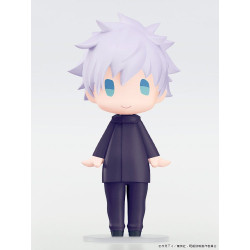 From a design point of view, the figure relies on clean, simple shapes. Gojo’s signature white hair is sculpted in spiky, tousled strands that form a large, fluffy halo around his head. His round face features big blue stylized eyes and a small, gentle smile. He wears his familiar dark uniform, simplified here into a long high-collared top and matching pants with minimal detailing, in line with the HELLO! GOOD SMILE aesthetic. His arms are slightly out to the sides with open hands, and the figure stands on its own feet, making it easy to display on a shelf or alongside other small-scale chibi figures.