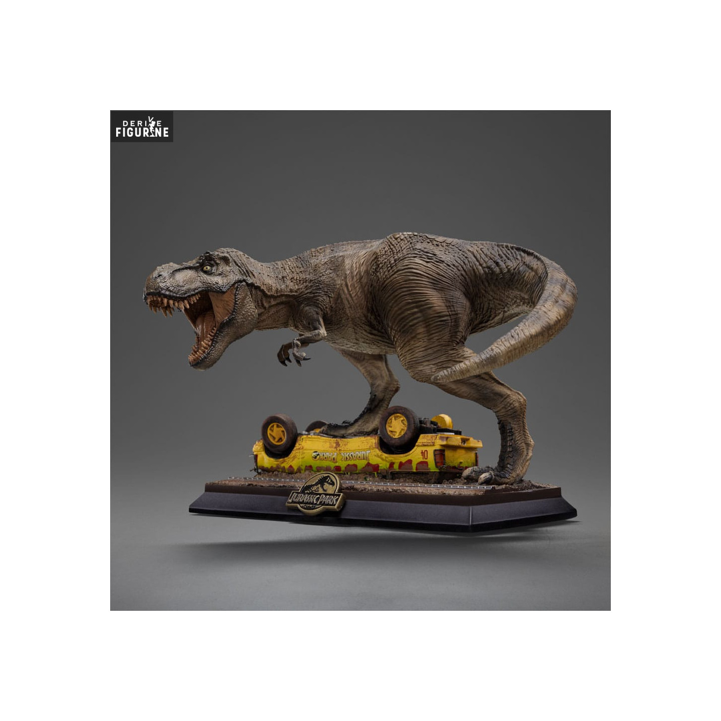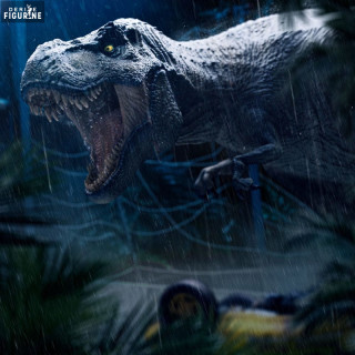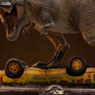 The figure's base is just as impressive, featuring debris and park elements, including an iconic vehicle crushed beneath its powerful feet, reminiscent of the legendary scene from the film where the T-Rex chases park visitors. This careful staging enriches the story this figurine seeks to tell, making this model a captivating focal point in any collection.