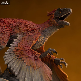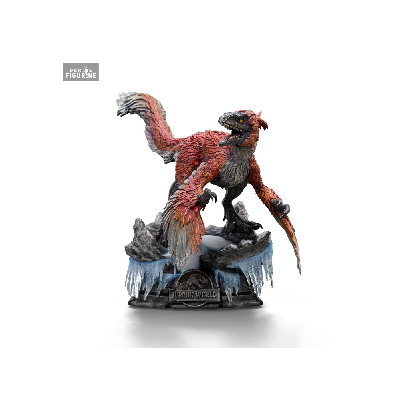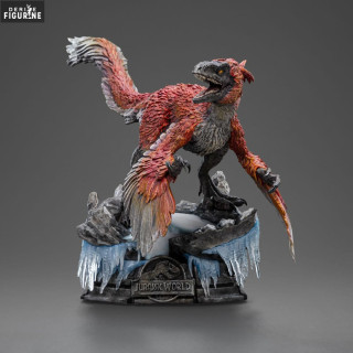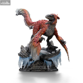 This figure depicts the dinosaur in an attacking pose, ready to pounce on its prey. Made of high-quality resin by Iron Studios, it measures approximately 19 cm wide, 17 cm deep, and 28 cm tall, at a 1/10 scale. Every detail, from the textured feathers to the sharp claws, is faithfully reproduced to offer a stunning collectible piece. The base, adorned with elements reminiscent of the film's icy setting, adds a touch of realism and immerses the viewer in the Jurassic World universe.