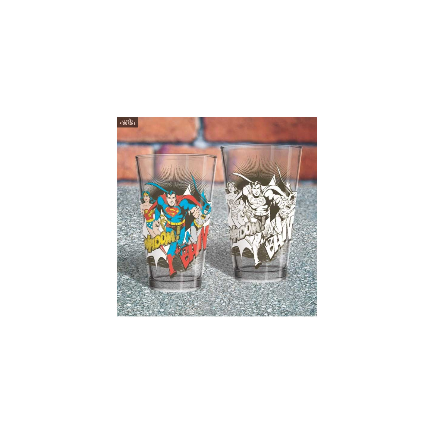 This glass presents three super heroes: Superman in the center, Wonder Woman on the left and Batman on the right. The heroes are black and white, with onomatopoeia.