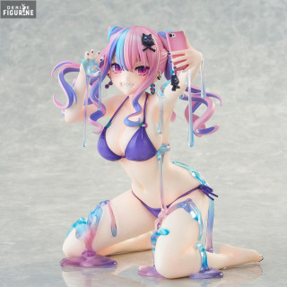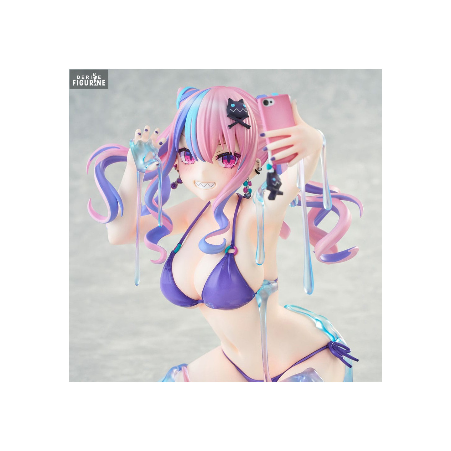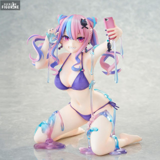 Kurara Tokishima is pictured here in a bold purple bikini, holding a pink smartphone for a cheeky selfie. Her long two-tone hair, mixing pink and blue hues, is styled in two pigtails that add a touch of fantasy and youthful charm. The figure is full of captivating details, from the delicately sculpted strands of hair to the painstakingly crafted accessories, like the cat-shaped bow on her hair.