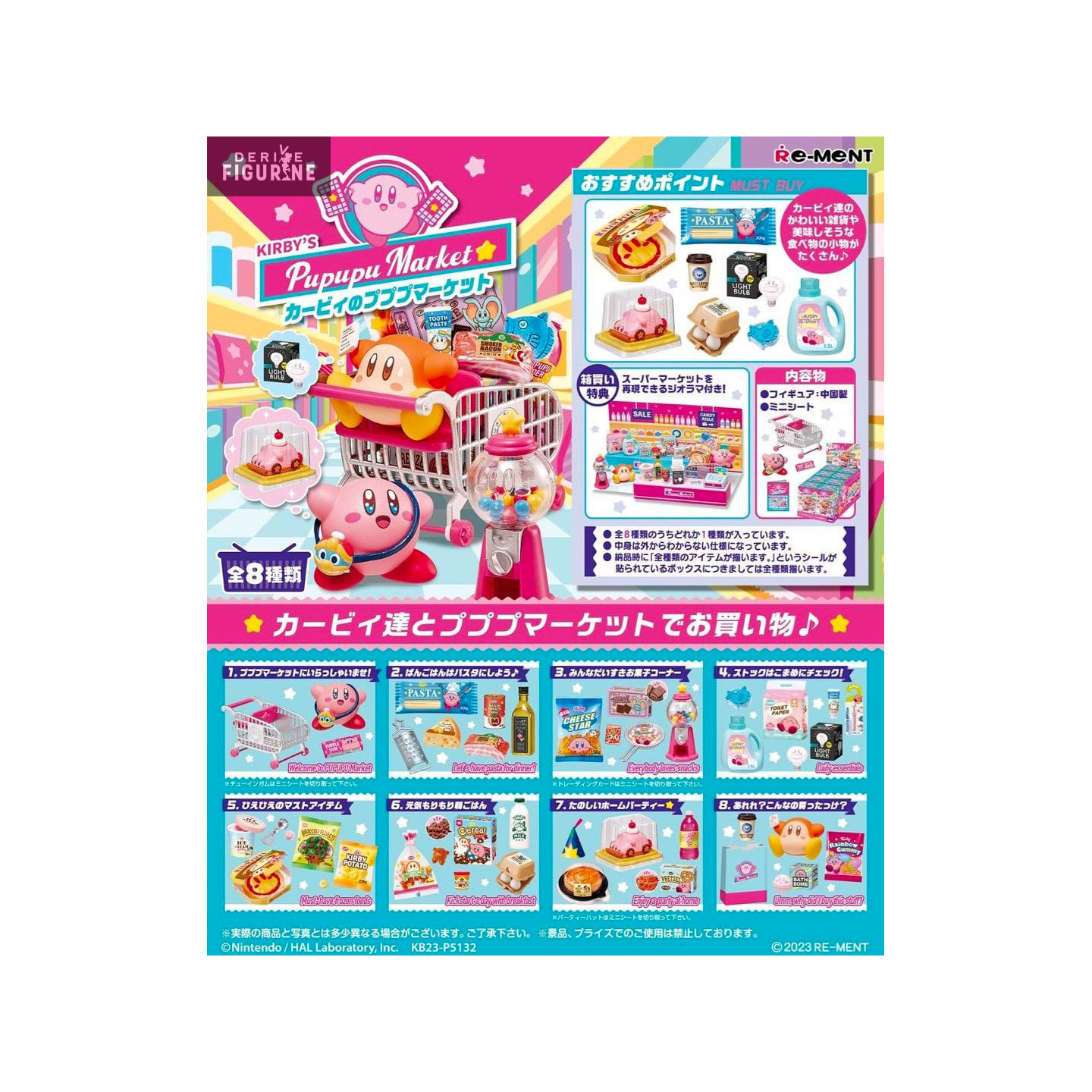 Discover the adorable world of Kirby with the Pupupu Market collection. Choose between the complete pack or a random figurine among the eight models available: "Welcome to Pupupu Market", "Let's have pasta for dinner!", "Everybody loves snacks", "Daily essentials", "Must-have frozen foods", "Kickstart a day with breakfast", "Enjoy a party at home", and "Umm, why did I buy this stuff?". Each figurine represents a unique scene related to Kirby's daily and playful life in the Pupupu market. Add these figurines to your collection to remember the fun and colorful adventures of the famous pink character.