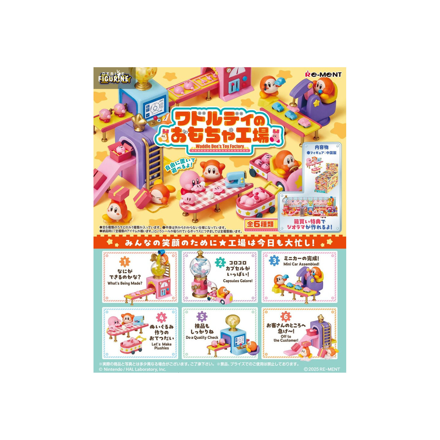 Made of PVC, the figures stand approximately 5 to 7 cm tall. With clean finishes and a style faithful to the Kirby games, they’re fun, adorable, and easy to collect. The series includes 6 different sets—available individually or as a complete box to build the full factory floor.