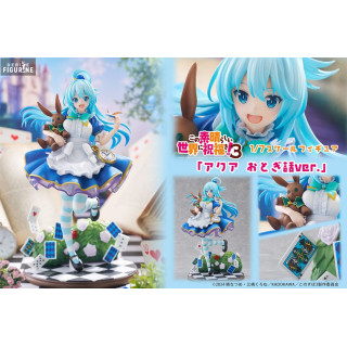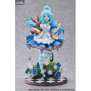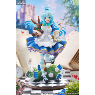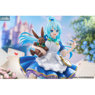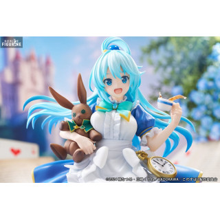 This figurine presents Aqua in an outfit inspired by Alice in Wonderland, with a blue dress adorned with a white apron, blue and white striped stockings, and accessories reminiscent of the fantasy world of the tale. It is accompanied by a stuffed rabbit, a golden pocket watch and a decor filled with playing cards and roses, reinforcing the dreamlike and playful aesthetic of this interpretation.