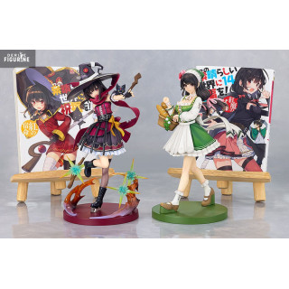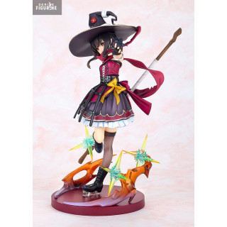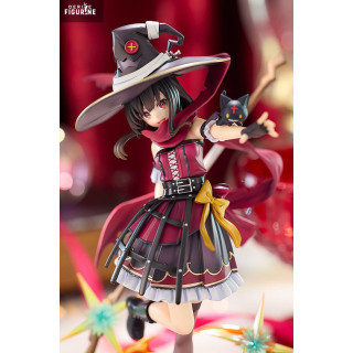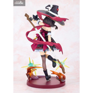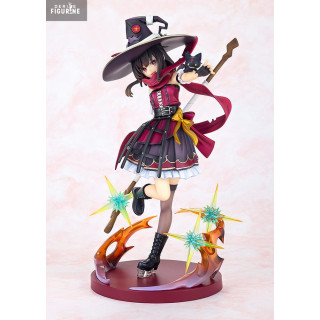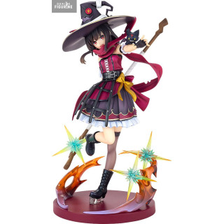 In the KonoSuba universe, Megumin is famous for her fiery personality, her impatience with any magic that isn't Explosion, and her tendency to create situations that are as disastrous as they are humorous. This figure, created to celebrate the 10th anniversary of the Light Novel, perfectly captures Megumin's explosive charm. Made of PVC by Kadokawa, it stands approximately 18 centimeters tall and depicts Megumin in all her magical glory. With a dramatic gesture, she brandishes her staff while holding Chomusuke, her faithful feline companion, ready to unleash a devastating explosion. The light effects surrounding her add a dynamic dimension to the figure, capturing the precise moment when her magic is about to erupt.