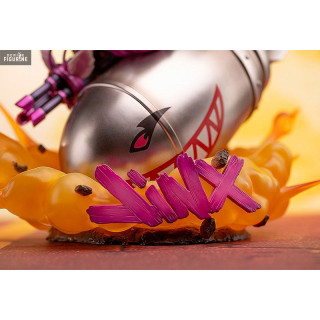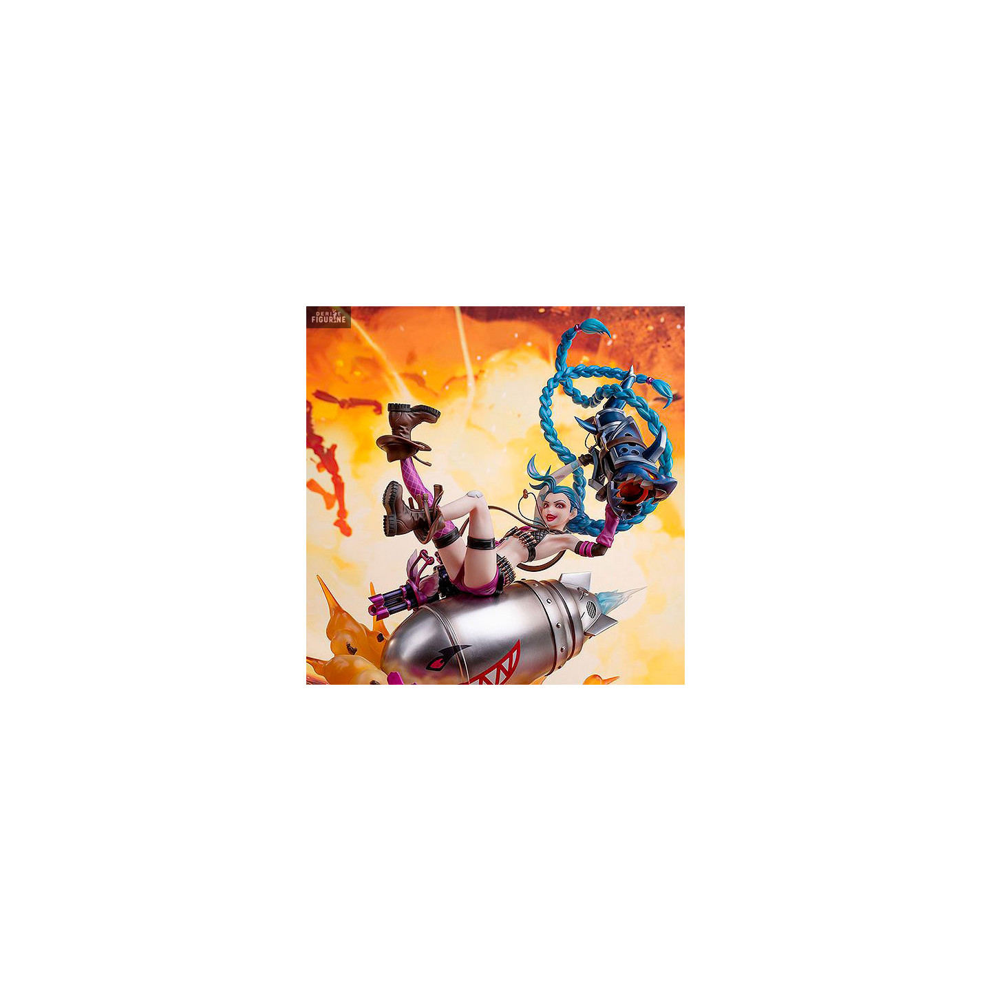 In the competitive League of Legends video game, the crazy and beautiful Jinx is a completely unpredictable and dangerous criminal! Her goal is to wreak havoc in any situation and for that, she has weapons that allow her to blow everything up from anywhere! So it's the best possible mood that we see her here on the back of a rocket ready to blow everything up!
