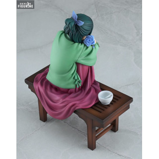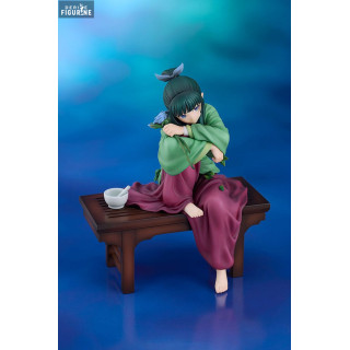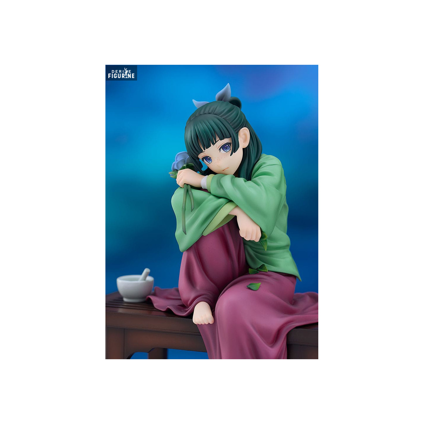 The Maomao figurine is an exquisite representation of the main character from "The Apothecary Diaries". Maomao, with her long green hair and expressive eyes, sits on a wooden bench, delicately holding a blue flower. Her traditional clothing is beautifully reproduced, with a pastel green kimono and purple hakama, every fold of the fabric rendered with careful attention to detail. The combination of soft colors and Maomao's relaxed posture give this figurine a serene and soothing atmosphere.