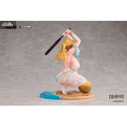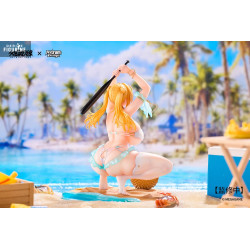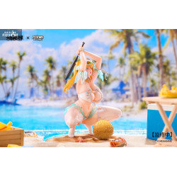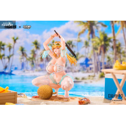 From the video game Daiblos Core, Aymur makes a wild appearance in this offbeat summer version: Honey Assault. Captured mid-squat on a beach, with a stick raised above her head and ready to smash a durian fruit, she strikes a balance between absurdity and boldness with unapologetic flair.