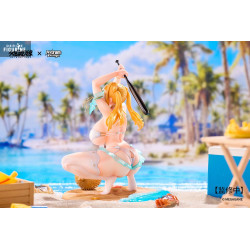 She’s outfitted in a bikini with turquoise and gold accents, sheer tulle sleeves, and gold accessories including a necklace, bracelets, and sunglasses perched on her head. Fine sculpting details bring the textures of fabric, skin, and motion to life. The beach-style base includes sand, shells, and clear summer vibes.