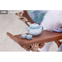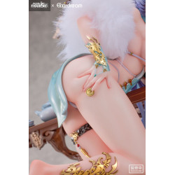Leaning gently against an intricately carved table, Zeus adopts a relaxed pose with her eyes half-closed and gaze lowered. Her long blue hair flows softly over her shoulders, and her arched back and crossed legs add a graceful, subtle sensuality to the composition.
