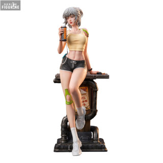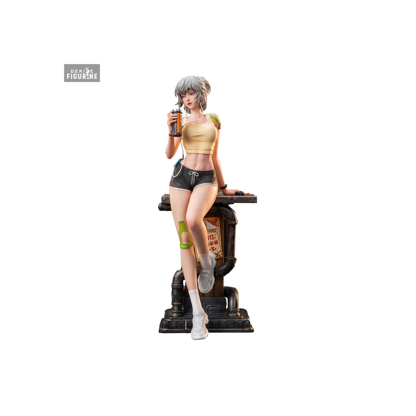Wearing a gold crop top, black athletic shorts, and crisp sneakers, she leans against a damaged urban post covered in torn Mandarin posters. Her pose is relaxed, yet alert. The sculpt includes sharp details—headphones, knee wraps, colorful tape, and a sleek, confident look that speaks volumes.