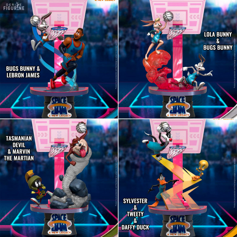 Space Jam: A New Legacy is the new basketball-themed actor-mixing and famous Looney Tunes movie and here are four D-Stages to choose from where you can choose between Classic or New Version formats. So there is Bugs Bunny with Lebron James, the Tasmanian devil with Marvin the Martian, Sylvester with Titi but also Daffy Duck or finally Lola accompanied by Bugs from the Bunny family!