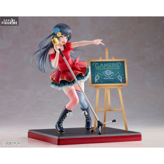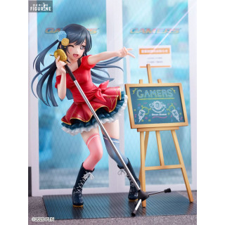 The Odaiba Gamers Signboard Girl figure captures Setsuna in a lively and enthusiastic pose. Dressed in a colorful and stylish outfit, with a frilly skirt and carefully detailed accessories, she is depicted in a moment of animation, holding a golden microphone. Her bright smile and confident posture evoke the electrifying performances she delivers in the series. The figure comes with a "Gamers" signboard, adding a unique touch that references the world of gaming and music she thrives in. The attention to detail, from the movement of her hair to the expression on her face, reflects Setsuna’s spirited nature and overflowing energy.