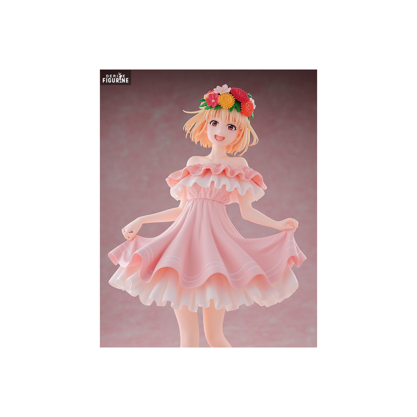 This figure, produced by Good Smile Company, beautifully captures Chisato Nishikigi’s joy and elegance in a light and airy pose. Standing 20 cm tall and made of PVC, she is depicted in a flowing pink dress, adorned with delicate frills, and wearing a vibrant flower crown, symbolizing a moment of pure happiness. Her soft, joyful expression and the intricate detailing of her outfit make this a must-have piece for collectors and fans of Lycoris Recoil.
