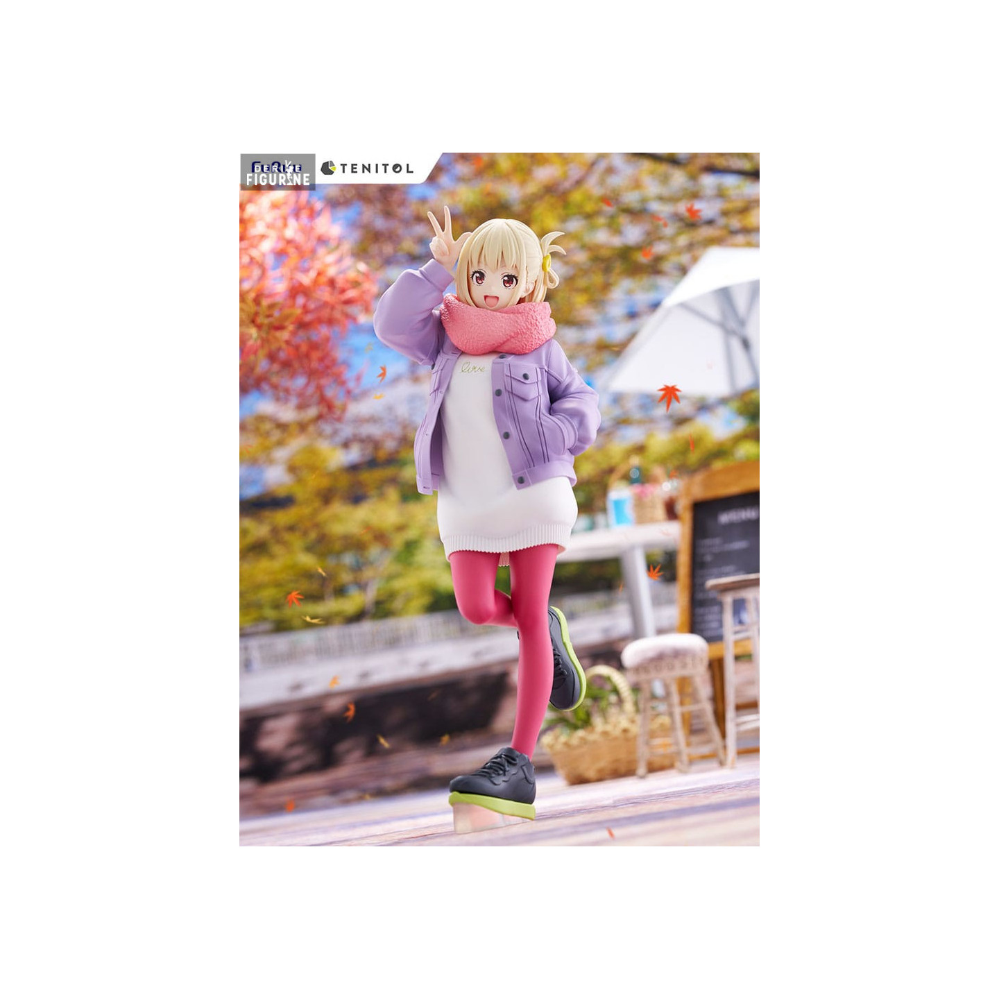 Chisato Nishikigi is known for her boundless energy and infectious smile, traits that this figure reproduces with impressive fidelity. Dressed in the most charming fall outfit, she sports a lightweight purple jacket over a sleek white dress, complemented by a pink scarf that adds a touch of sweetness to her ensemble. The details of her outfit, such as the delicately carved buttons and natural folds of the fabric, are made with remarkable precision, reflecting the care taken in its construction.