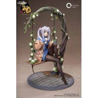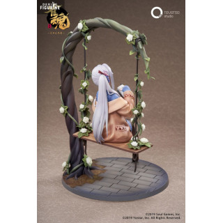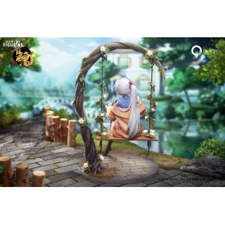 The detail of the sculpture is impressive, with particular attention paid to the textures and nuances of his clothing and accessories. The swing, adorned with delicate flowers, adds a dimension of natural beauty to the scene. The figure's base is also carefully designed to complement the set, with a stone path and greenery elements that reinforce the peaceful atmosphere.