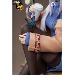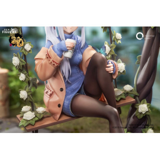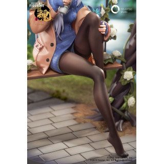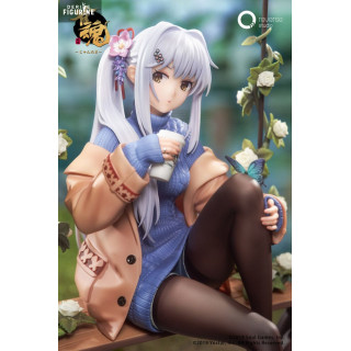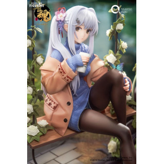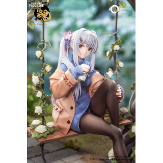 The figure perfectly captures Yui's elegance and grace. She is dressed in a beige coat with a blue sweater underneath, adding a touch of warmth and comfort to her appearance. Her long silver hair falls delicately around her face, adding a sense of movement and fluidity to the figure. Yui's pose, with a cup in her hand and a serene smile, creates an ambiance of tranquility and relaxation.