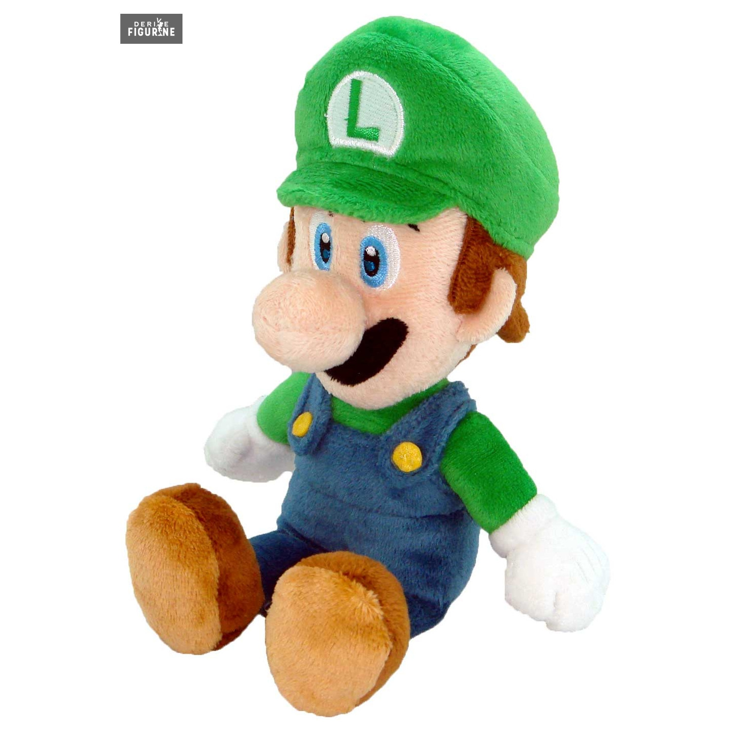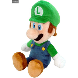 Super Mario Bros. plush representing Luigi, which measures approximately 23 centimeters high. The manufacturer is Little Buddy Toys.