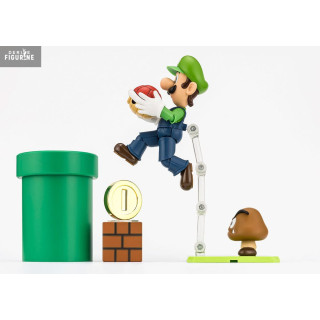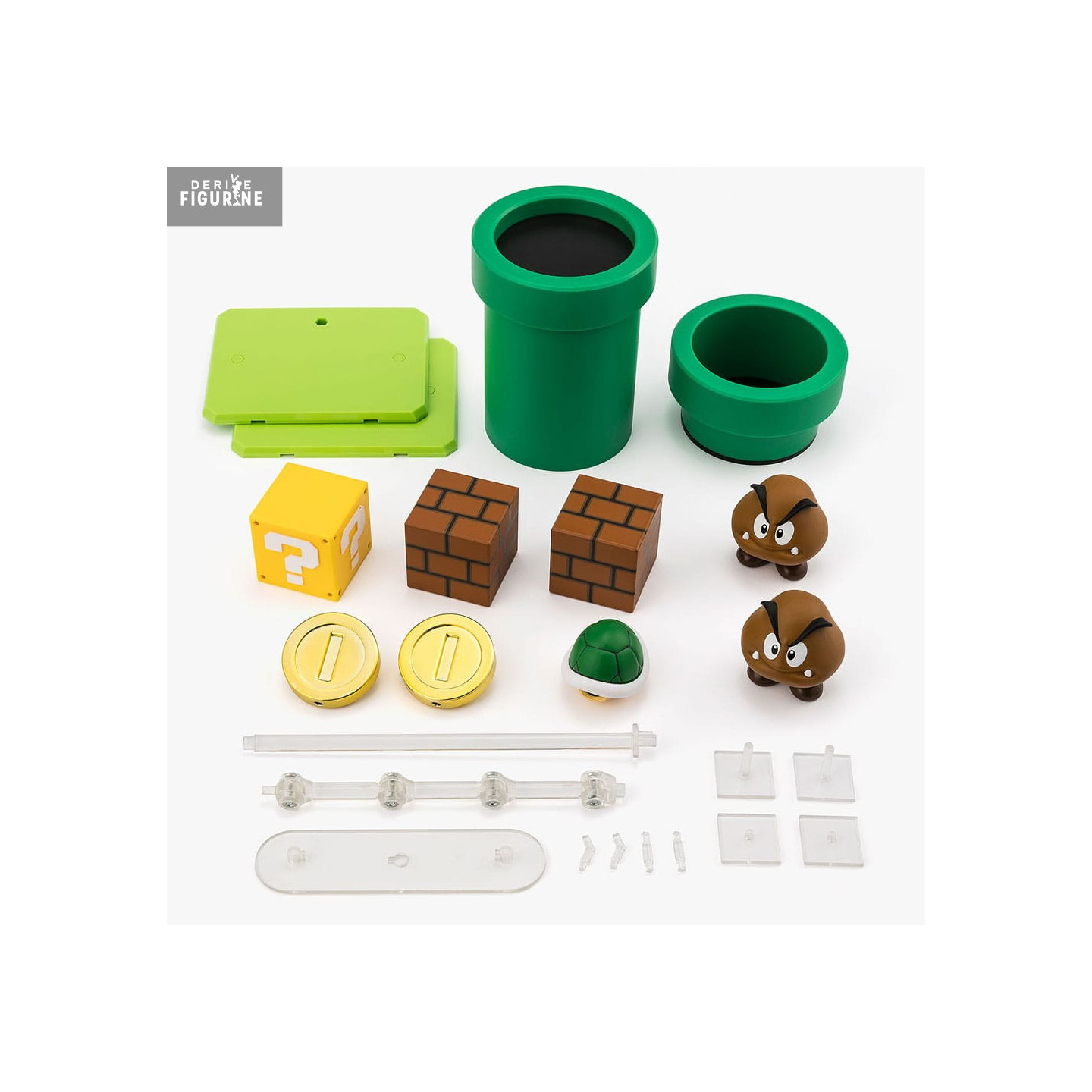 The set includes must-have elements: green pipes in two sizes, brick and “?” blocks, gold coins, a green shell, angry-faced Goombas, and clear display stands to pose them creatively. Everything is game-accurate and full of nostalgic charm.