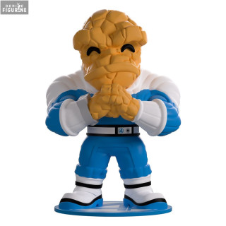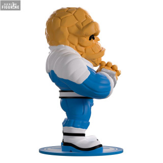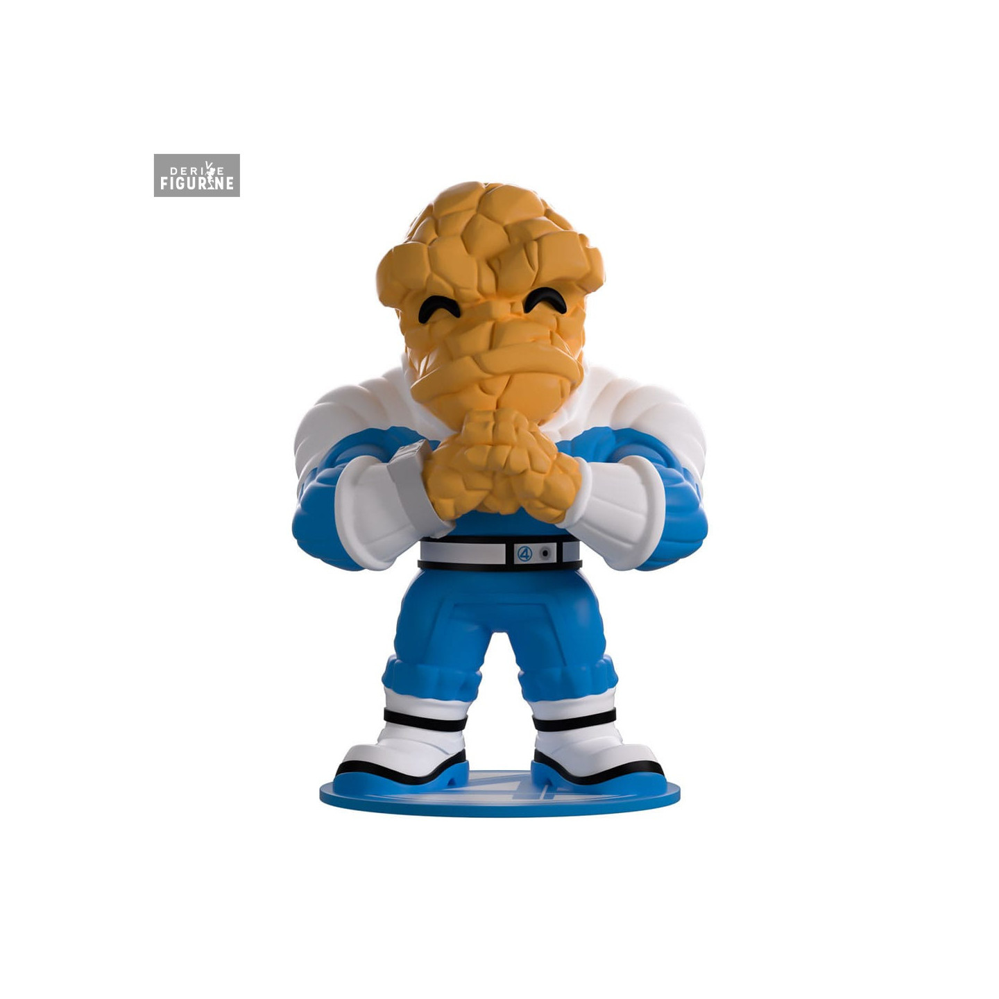 This official Youtooz figure shows him in a playful and unusual pose, with his hands clasped in front of him, as if preparing a thankful gesture or respectful greeting. His blue-and-white Fantastic Four suit is faithfully recreated, with the “4” emblem clearly visible on his belt. His head and body feature the distinctive rocky texture of his skin, stylized in the unique Youtooz design.