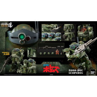 Scopedog's design is recognized for its medium-weight armor, and although the figure is not to scale, it accurately reproduces the size difference compared to the heavy-weight Armored Trooper “Robo-Dou Rabidly Dog” already got out. The figure features a die-cast zinc alloy interior frame that offers approximately 76 points of articulation, allowing for exceptional posing and interactivity.