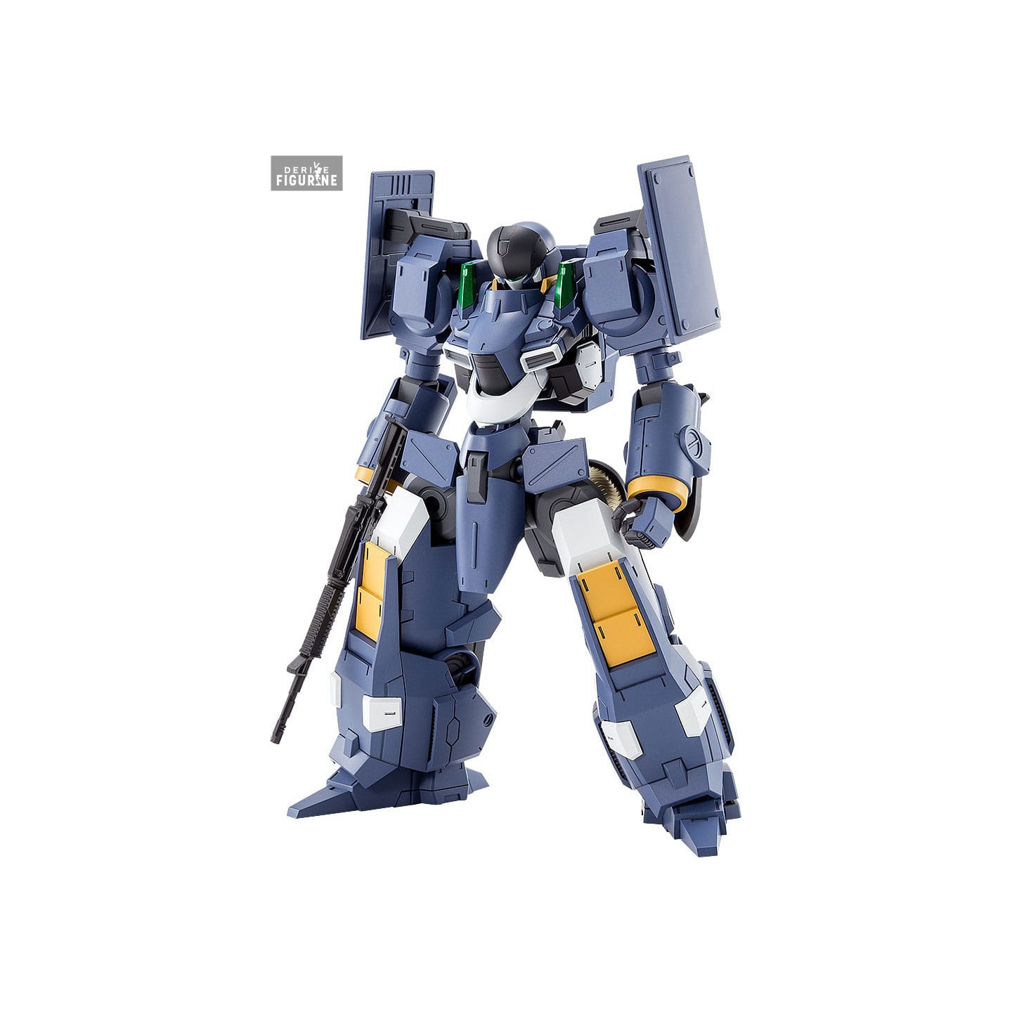 The Side:R Blitzschlag is designed with an imposing and detailed aesthetic, painted in shades of dark blue and gray with pops of yellow and green that accentuate the sensors and lights on its armor. This combat robot is equipped with a full arsenal, including an assault rifle and combat knife, which emphasize its role as an advanced war machine in futuristic conflicts.