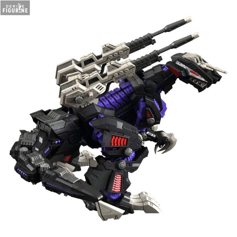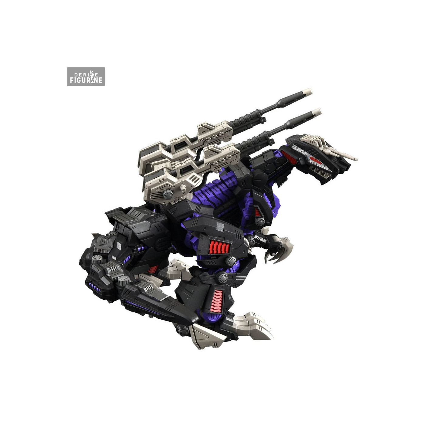 The RMZ-002 Geno Saurer figure is carefully detailed, with articulated components that allow for various dynamic poses. Black, purple and red colors accentuate its menacing appearance, while the weapons mounted on its back add a touch of technological sophistication. Every aspect of this model has been designed to capture the essence of Geno Saurer as he appears in the Zoids anime and video games.