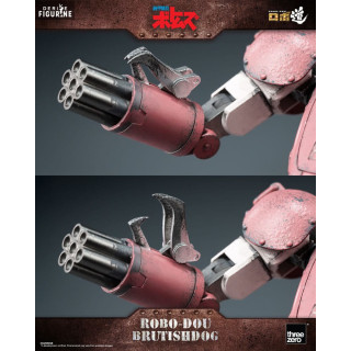 The Robo-Dou Brutishdog figure, standing approximately 15 cm tall, is manufactured by ThreeZero. Although the scale is not specified, the piece showcases ThreeZero’s trademark craftsmanship: detailed weathered paintwork, high poseability, and superb mechanical detail. The cockpit opens to reveal a tiny pilot figure, and a variety of accessories are included — interchangeable hands, a rotating machine gun, firing effect parts, and multiple articulated components. Whether in a combat stance or display pose, the Brutishdog exudes power and menace.