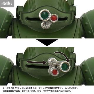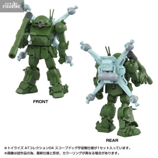 Official figure of Scopedog, Space Battle which measures approximately 8 centimeters high, scale 1/48. It is from the AT Collection 04 Toyrise collection. The manufacturer is Takara Tomy.