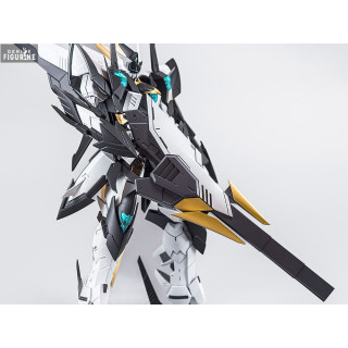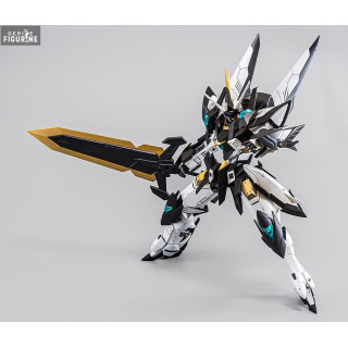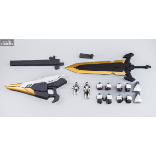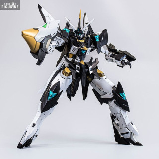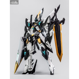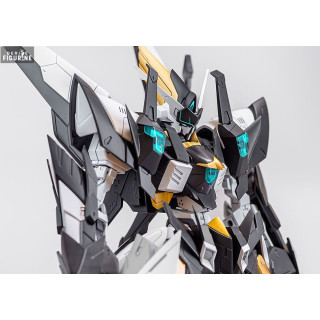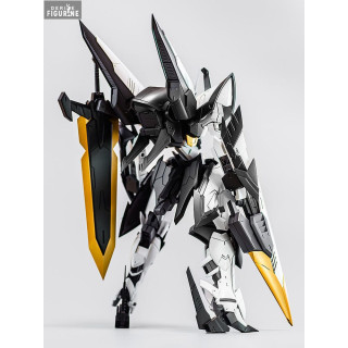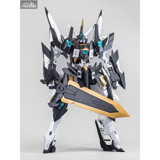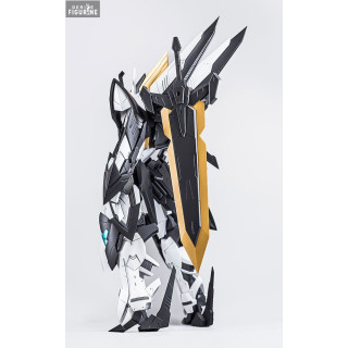 Side:GR Arklaud is an awe-inspiring mecha from the Titanomachia universe, blending elegance with raw power. With its sharp design, sophisticated armor, and futuristic lines, it embodies the ultimate battlefield force. Equipped with a massive shield and an oversized sword, it is built to dominate its opponents through remarkable agility and resilience. Its black, white, and gold color scheme, accented with luminous emerald highlights, gives it a look that is both majestic and menacing.
