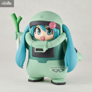 Hatsune Miku is more than a virtual idol—she’s a global phenomenon. And this figure leans hard into crossover territory, mimicking the classic Zaku design from Gundam with its green palette, black visor, and mechanical lines. The style is intentionally cute and exaggerated, turning a war machine into something joyful and collectible.