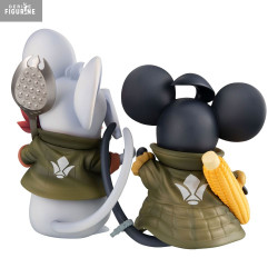 The figure features two anthropomorphic mice: one with dark fur, blue eyes, a braid, and a green jacket holding a corn cob; the other with white fur, large pink ears, a red scarf, and a bold expression. Both wear outfits inspired by their original uniforms from the show. The attention to detail—facial expressions, clothing, and accessories—reflects their distinct personalities.