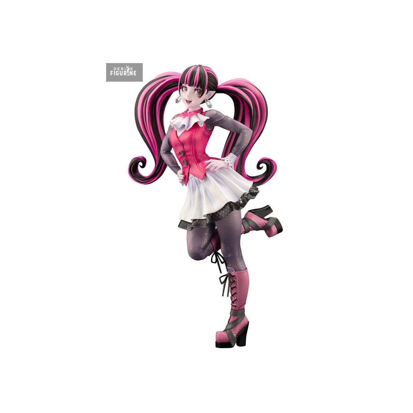 This Bishoujo statue by Kotobukiya features Draculaura in her signature look: dual pink-and-black ponytails tied with ribbons, highlighting her mix of dark and girly charm. Her fuchsia vest, white ruffled skirt, and glittery tights create a striking contrast.
