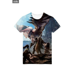 Monster Hunter fans will be happy to wear a t-shirt with the colors of their favorite game. There are three hunters who are ready to fight a Rathalos. The impression was made by sublimation.