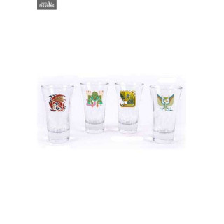 Set of four Monster Hunter World liqueur glasses. Do not put in the dishwasher. The manufacturer is Level Up Wear.