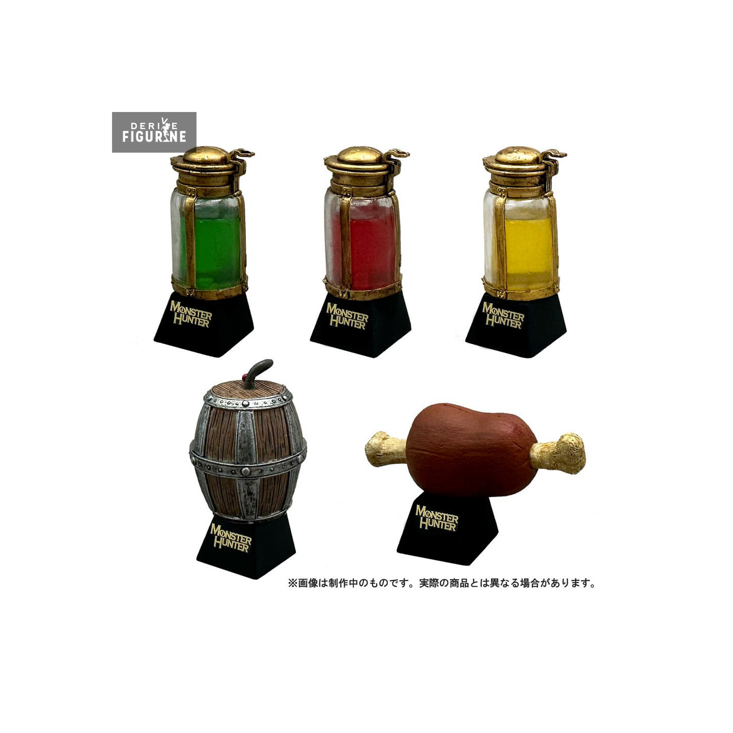 The Monster Hunter Desktop Figure collection offers you to get one of five different models among the recovery pills, marinated meat and or the big metal bomb.