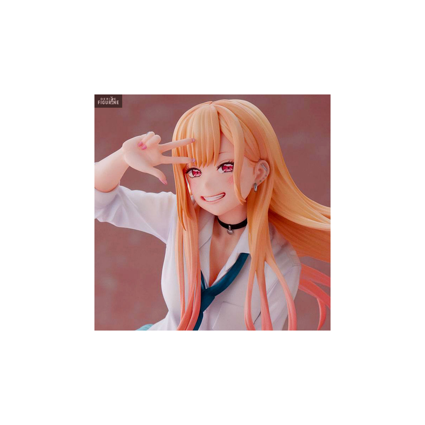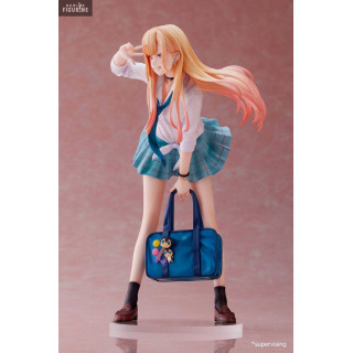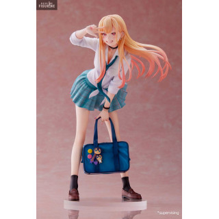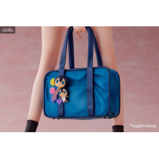 Marin Katagawa from My Dress Up Darling is a popular young girl in high school. Of great beauty, she does not go unnoticed and knows how to stand out with her extroverted look. Her clumsy side makes her even more adorable. She is a big fan of anime and adult games, who on top of that, loves to cosplay. She is shown here in a high school uniform with a white blouse, blue tie and blue plaid skirt. She carries her blue school bag where you can see small figurines attached to it. She even strikes a great pose with a big smile to complete your collection!