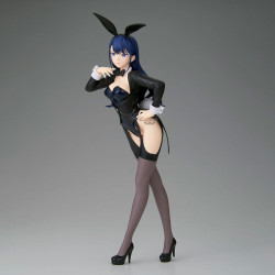 Visually, Marin is sculpted standing with her legs crossed, one hand resting on her hip while the other lifts near her face for a flirty, model-like gesture. She wears a black bunny-style outfit: a deep-cut leotard with a jacket-like long-sleeve look, a bow tie at the neck, and white cuffs at the wrists. She has long dark stockings and black heels, with garter-style details visible at the top of the thighs. Her hair is long, wavy, and deep blue, topped with tall black bunny ears, and her blue eyes give her a soft but self-assured expression.
