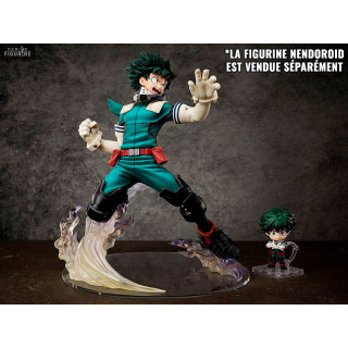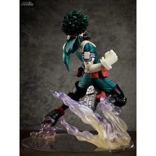 This figure from the anime and manga My Hero Academia represents the hero Izuku Midoriya in full-scale realization and in full action. The superhero born without alter of MHA is here sublimated with a look filled with determination and a base with effects.