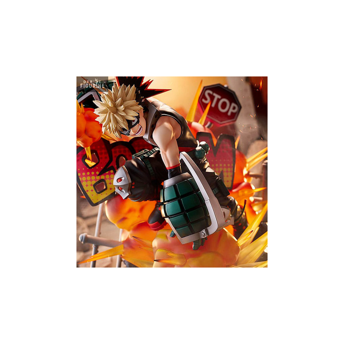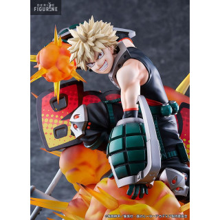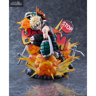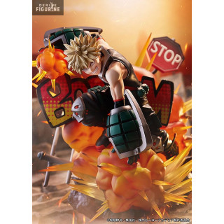 This scale figure captures the intensity of Katsuki Bakugo's character in a dynamic pose, ready to unleash his explosive power. The three-dimensional "BOOM" visual effect adds a dynamic touch to the figure, reinforcing the impression of an imminent explosion from his "Explosion" alter.