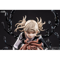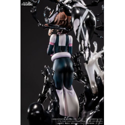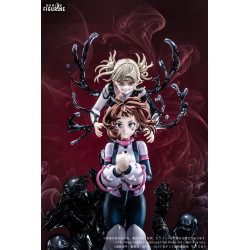 This dynamic figure captures them in a dramatic and symbolic moment: Ochaco floats slightly, hands clasped nervously, in her hero outfit. Behind her, Himiko appears with a mischievous, eerie grin, surrounded by black organic appendages that resemble claws or branches. The base is a swirling mass of shadowy humanoid figures, suggesting the encroaching darkness.