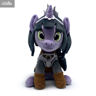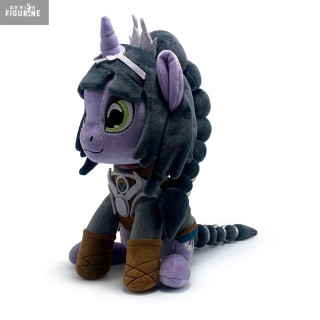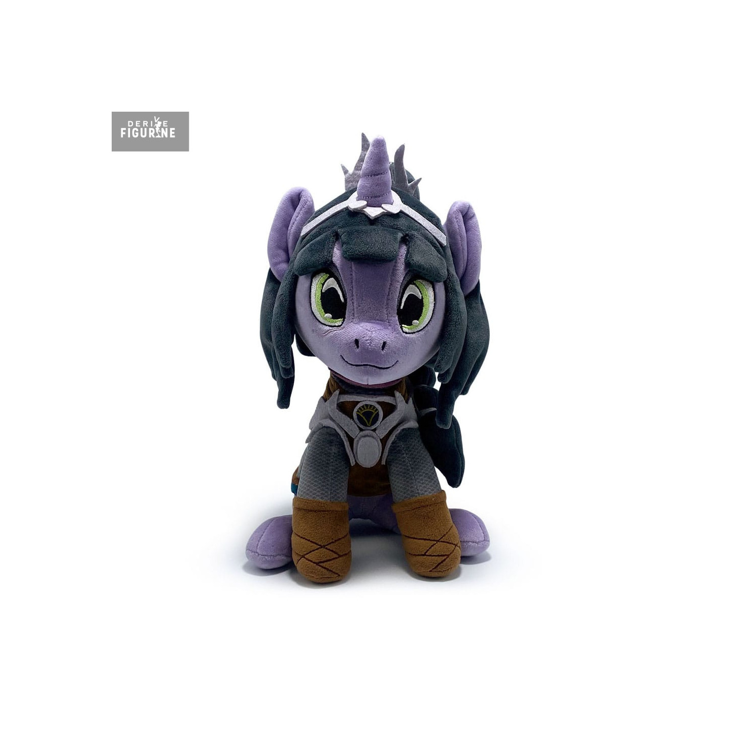 The plush faithfully captures her silhouette: a light purple body, a black mane braided into thick plaits, and prominent pointy ears. Her spiraled horn and small silver crown adorned with a star symbolize her princely status. The necklace engraved with celestial motifs and the booties encasing her hooves emphasize her majestic yet mysterious air.